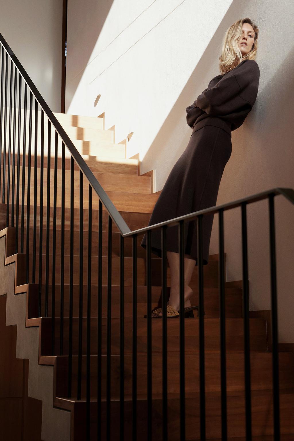 You can also make a chic outfit by combining a sweatshirt and loose pants. The loose pants give it a slightly flared silhouette, and you can expect a leg length effect. The high waist slightly above the waist makes the waist area look neat as well, it makes a trendy and chic look. It goes well with a mock neck sweatshirt and trendy sandals.